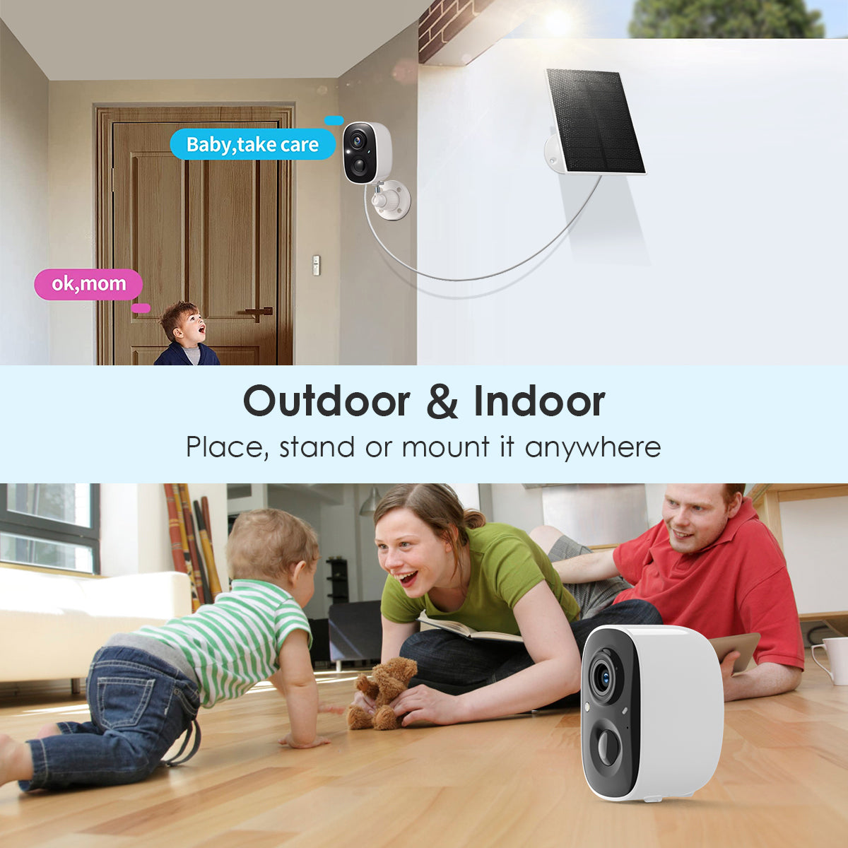 - [Wire-Free & Non-Stop Solar Powered Outdoor Camera] This solar camera with true cordless design. No wire, no hassle. Sustainable solar powered and battery powered, no need to recharge again and again. Environmentally friendly and sustainable energy, inject a steady stream of electricity into your camera. Don’t need to climb the ladder to recharge the battery periodically. (*Not work with 5GHz WiFi)